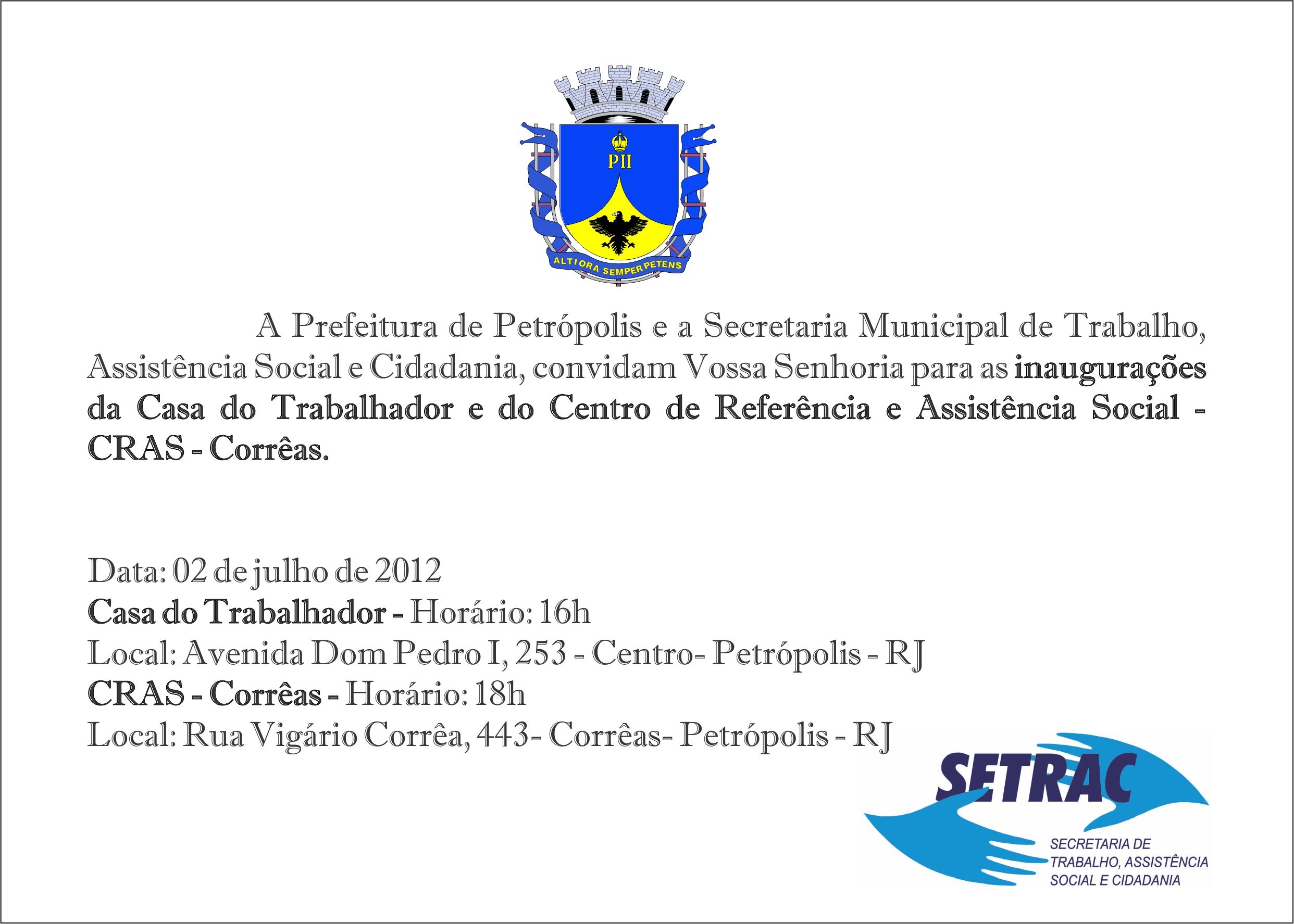 Segue anexo convite para inauguração da Casa do Trabalhador e do CRAS - Corrêas.
