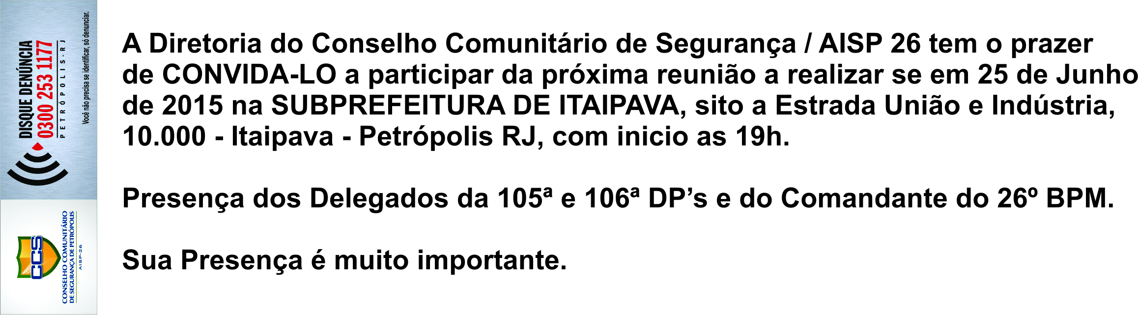 Convido a todos para a próxima Reunião do Conselho Comunitário de Segurança a realizar-se em 25 de Junho do Corrente na SUBPREFEITURA de Itaipava, sito a Estrada União e Indústria, 10.000 - Itaipava com inicio às 19 horas.