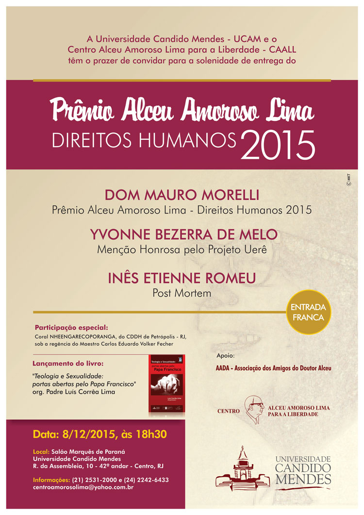Gostaríamos de convidá-lo para a entrega do Prêmio Alceu Amoroso Lima 2015 - Direitos Humanos, à realizar-se em 08 de Dezembro de 2015 às 18h 30min na Universidade Candido Mendes, Centro-RJ.