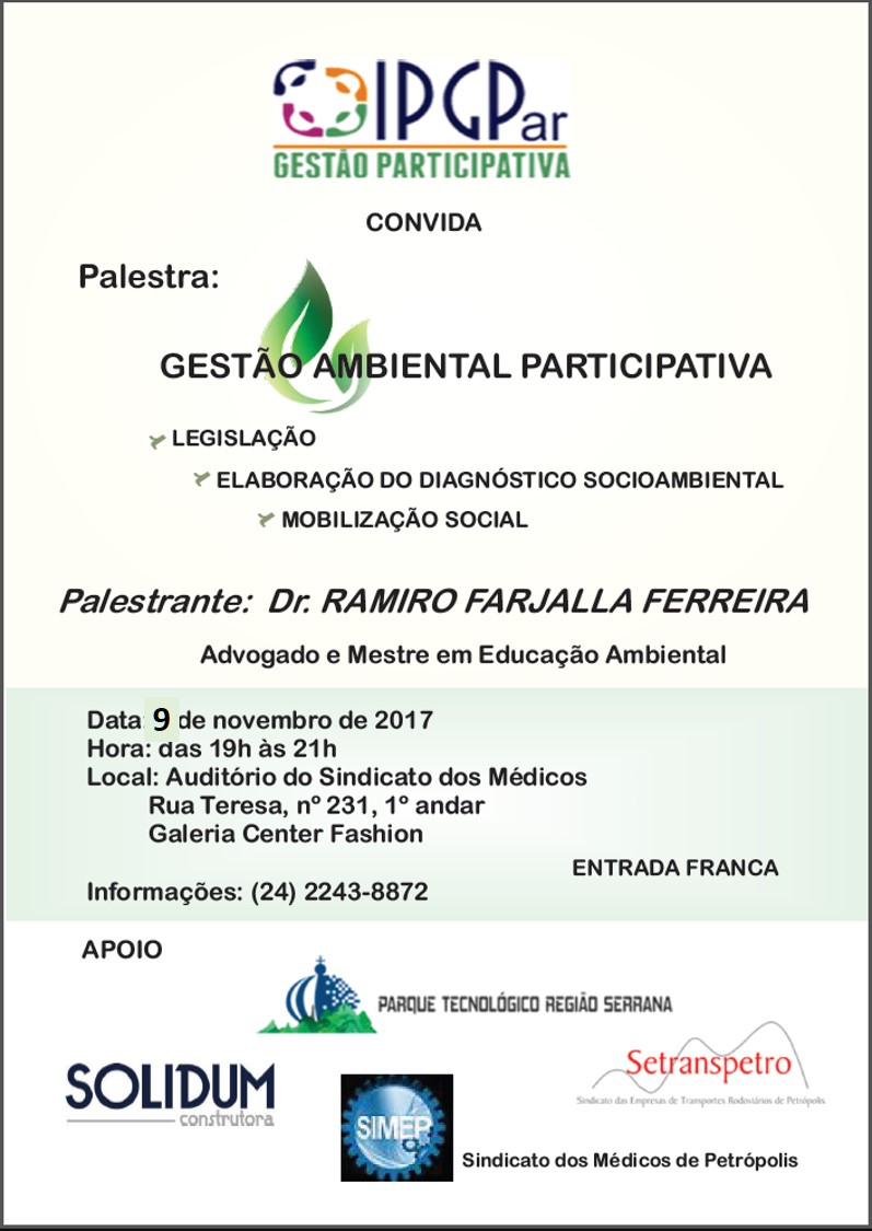 o Instituto Philippe Guédon Pró-Gestão Participativa, IPGPar, tem a honra de convidá-lo(a) a participar de mais um evento que integra o ciclo de Palestras e Cursos do projeto intitulado "A Petrópolis que Queremos":