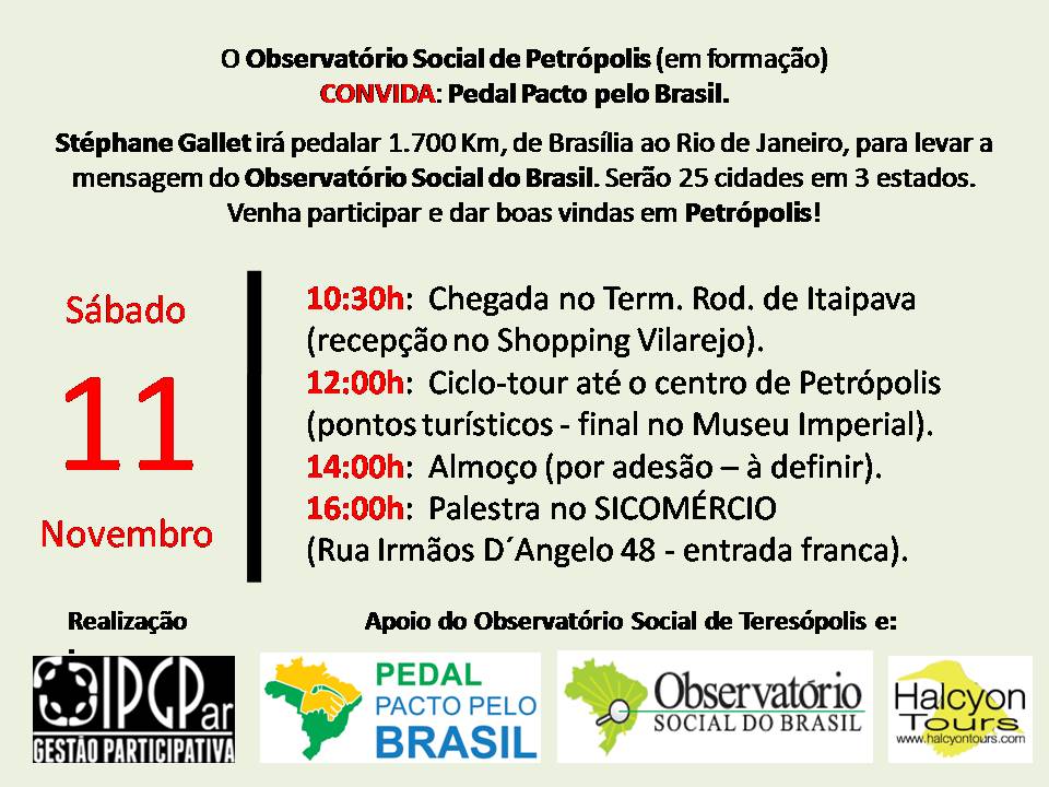 o Instituto Pró-Gestão Participativa, IPGPar, em apoio à formação do Observatório Social de Petrópolis, OSPetro, tem a honra de convidá-lo(a) a participar do “Pedal Pacto pelo Brasil” – projeto em conjunto entre a Halcyon Tours e o Observatório Social do Brasil, OSB, que visa explicar aos cidadãos, empresários e comerciantes como a presença do Observatório Social é importante para melhorar o uso dos recursos na gestão pública do município, fomentar a economia da região, facilitando e orientando as empresas a participarem das licitações da cidade.