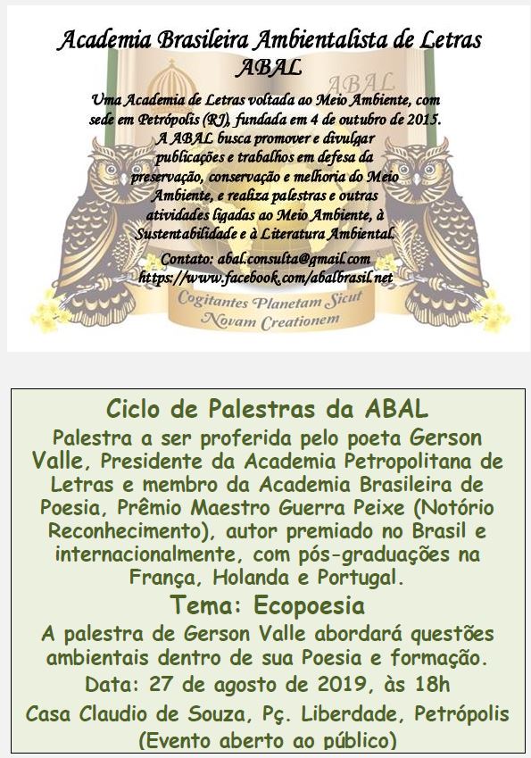 A Academia Brasileira Ambientalista de Letras – ABAL realizará este mês, em conjunto com a Academia Petropolitana de Letras, da qual o escritor e poeta Gerson Valle é presidente, mais uma palestra do Ciclo de Palestras da ABAL.