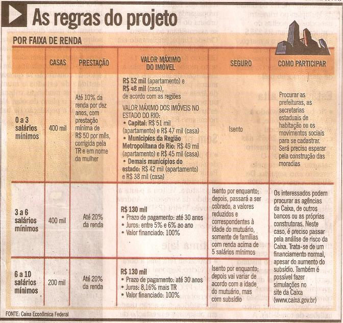 Já as famílias com renda de até três mínimos, principal foco do programa, com subsídio total da União, terão que esperar mais - cerca de um ano, segundo estimativas da Caixa - para que os empreendimentos sejam concluídos. Os interessados devem procurar as prefeituras, secretarias estaduais de habitação ou movimentos sociais para se cadastrarem.
